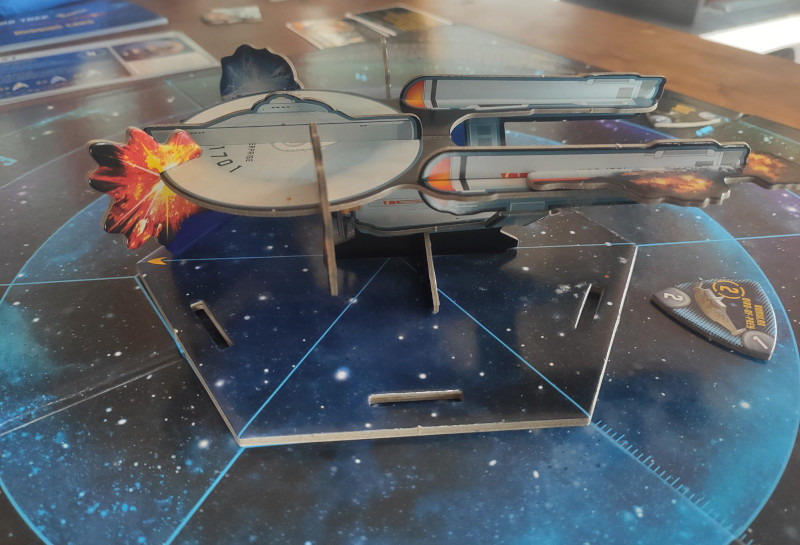 Nous sommes le 1er mai 2323, à bord de l’USS Enterprise avec Captain Sulu aux commandes et les talents de Pavel Chekov. La première mission, the enemy within, est assez vite gagnée, mais le vaisseau commence à s’abimer sérieusement pendant Charlie X, et c’est Deadly Years qui ne pourra être terminée : à chaque tour, on pioche moins de cartes action, rendant l’attaque et la défense impossible. L’USS Enterprise est abimé de toutes parts, et nous arrêtons la partie.
