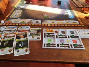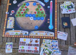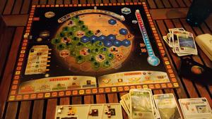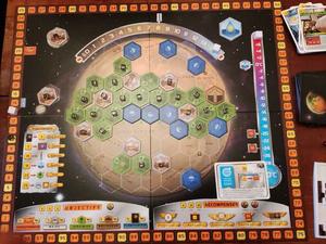 Assez rapidement, la guilde des mineurs arrive à augmenter ses revenus en acier, et en chaleur. Mais le bonus d’acier ne sert qu’assez peu au final, et bien que la terraformation progresse, le succès est encore loin. La construction d’une zone urbaine, entourée de forets, fera gagner de nombreux points de victoire. La capitale aussi rapporte 3 points d’un coup. La victoire se remporte au dernier tour, grace à une trésorerie bien garnie, l’oxygène et la température manquantes sont achetées contre monnaie sonnante.