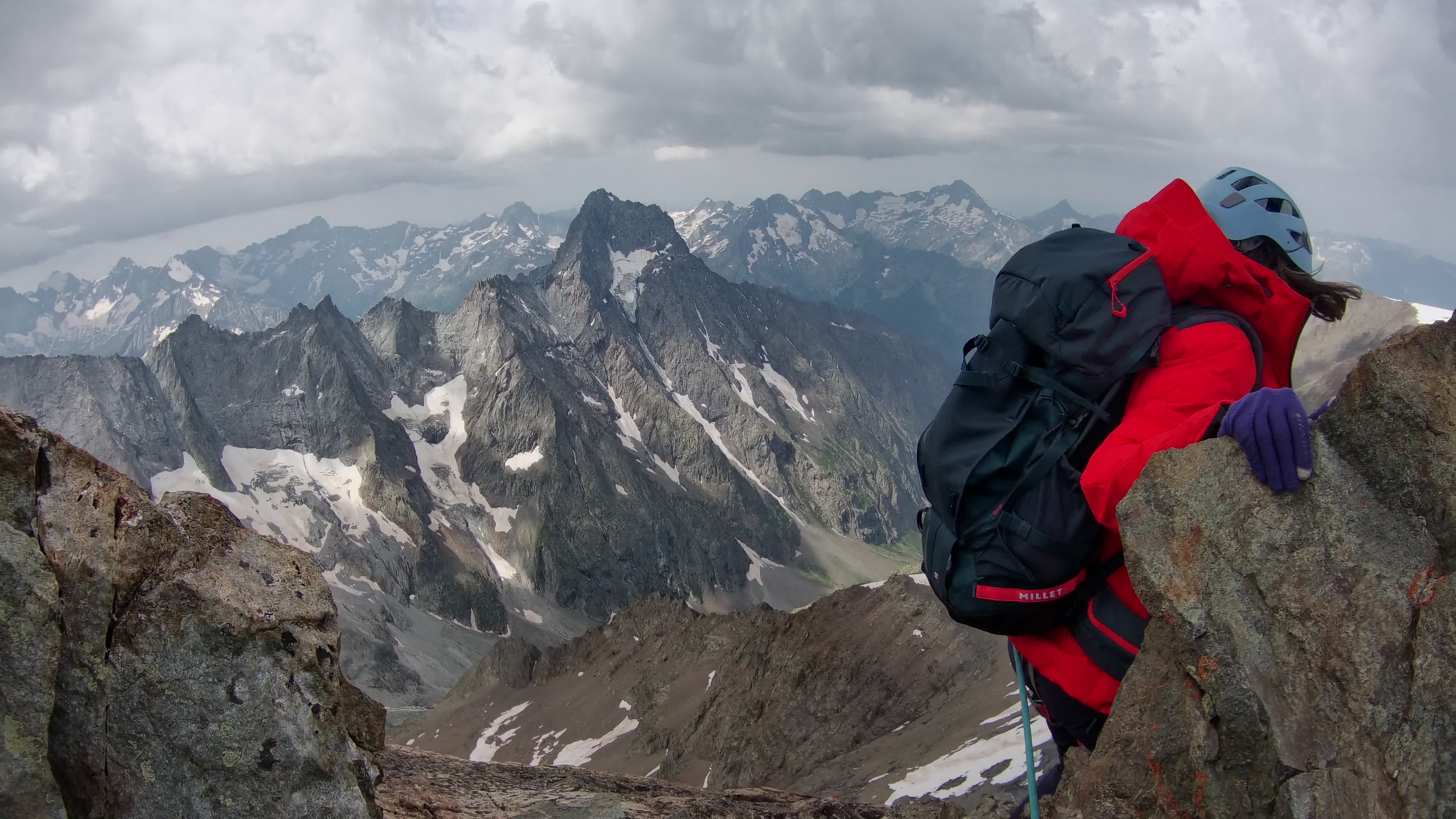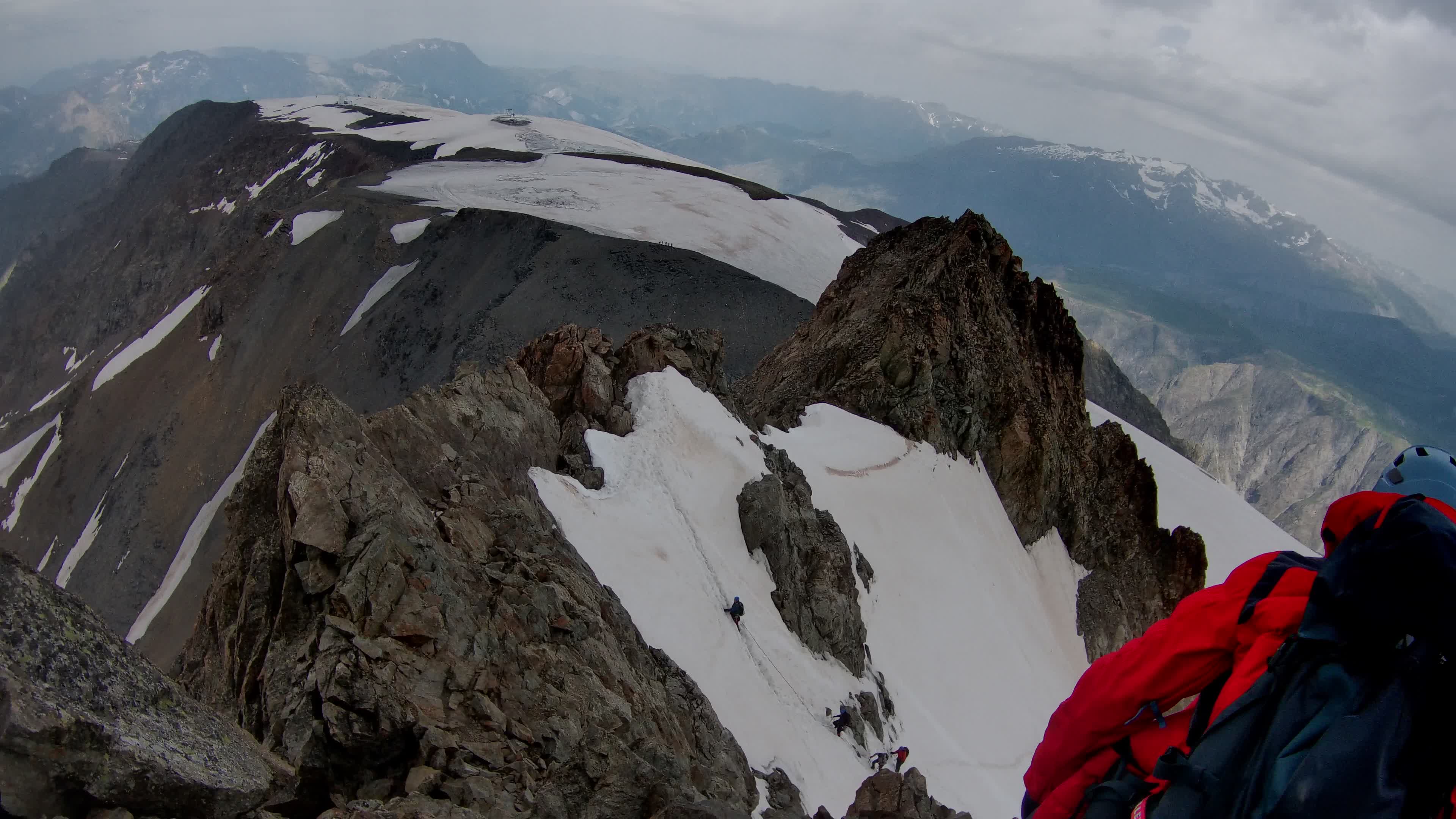 Pente raide pour monter jusqu’au Pic de la Grave. Sans parler qu’à cause du changement d’altitude rapide (?), j’avais un sacré mal de tête… On laisse les crampons à la fin de la montée, pour faire l’arête rocheuse. C’était un peu aérien (cf photos), mais bien assurés par notre guide Jean-Luc, je n’ai pas trop eu trop peur et me suis concentrée à la tâche. Pas vraiment d’escalade. Un peu de vent au sommet.