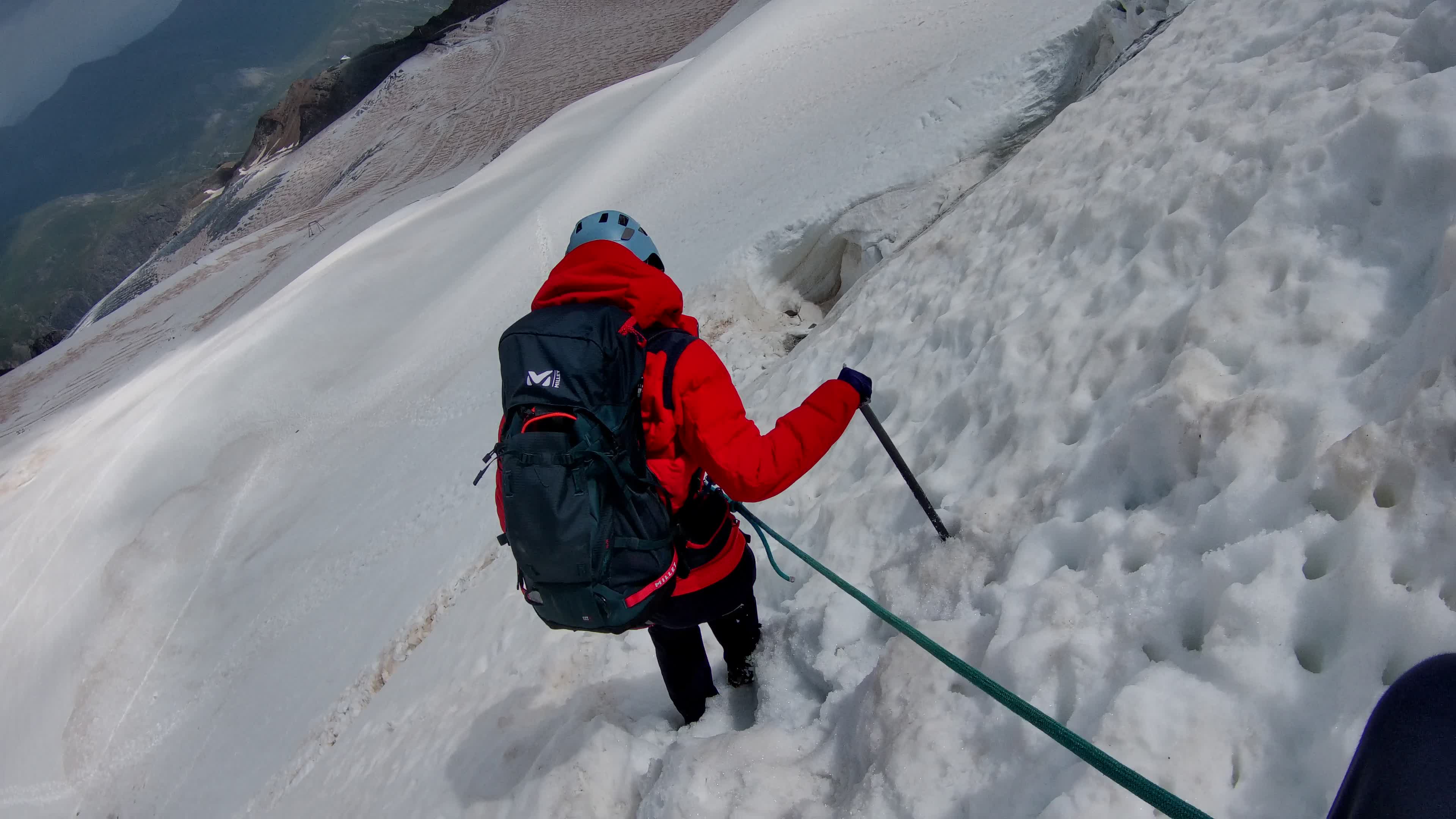 A la descente de la rimaye, Guillaume chute dans un trou de neige. Sans gravité.