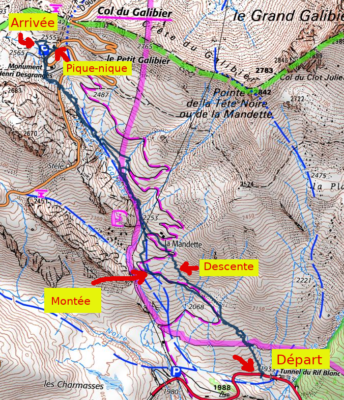 Montée vers la mandetteVue panoramique depuis le chalet du Galibier où nous avons pique niquéLà où nous nous sommes arrêtés - vers 2560 m. Pas de vue complète de l'autre côté hélas, mais c'est quand même beau.La vue est splendide tout au long de la randonnée